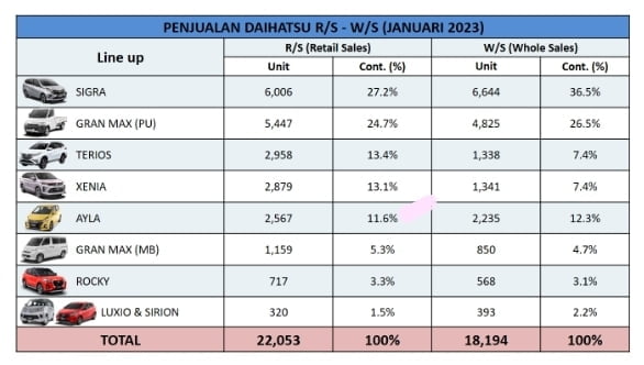 Secara volume dan kontribusi model, penjualan ritel Daihatsu pada Januari 2023 didominasi oleh top 3 model, seperti Sigra sebanyak 6.006 unit, atau berkontribusi sekitar 27,2%; disusul Gran Max PU (Pick Up) sebanyak 5.447 unit (24,7%); dan Terios dengan raihan 2.958 unit (13,4%).