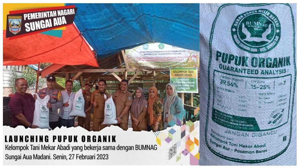 Acara peresmian Pupuk Organik Poktan Mekar Abadi bekerja sama BUMNag Nagari Sungai Aua dilaksanakan di lokasi Kelompok Tani (Keltan) Mekar Abadi yang dihadiri Kepala Dinas Pemberdayaan Masyarakat dan Nagari (DPMN) Kabupaten Pasaman Barat, Randy Hendrawan sekaligus membuka acara peresmian Pupuk Organik Poktan Mekar Abadi.