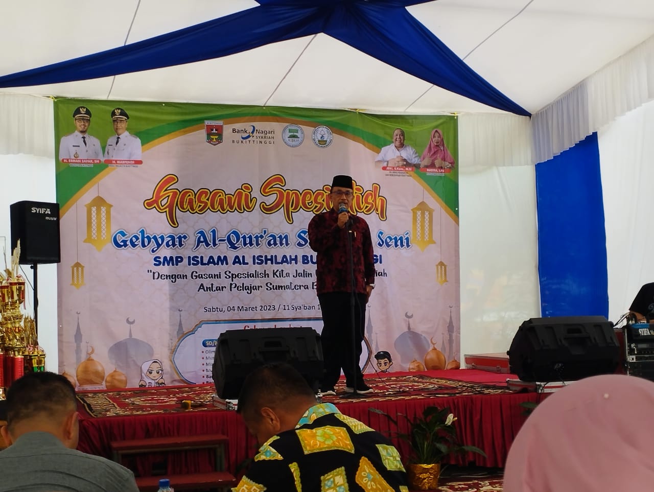 BUKITTINGGI, HARIANHALUAN.ID – Gebyar Al-Qur’an, Sains dan Seni SMP Islam Al Ishlah Bukittinggi (Gasani Spesialish) kembali digelar. Diikuti ratusan siswa SD dan SMP se-Sumatera Barat, Gasani Spesialish II dibuka secara resmi Wali Kota Bukittinggi yang diwakili Staf Ahli bidang Pemerintahan, Hukum dan Politik Johni di halaman sekolah tersebut, Sabtu (4/3). Kegiatan ini turut dihadiri forkopimca setempat, pengurus Yayasan Al Ishlah, Kepala SMP se- Kota Bukittinggi dan orang tua siswa.