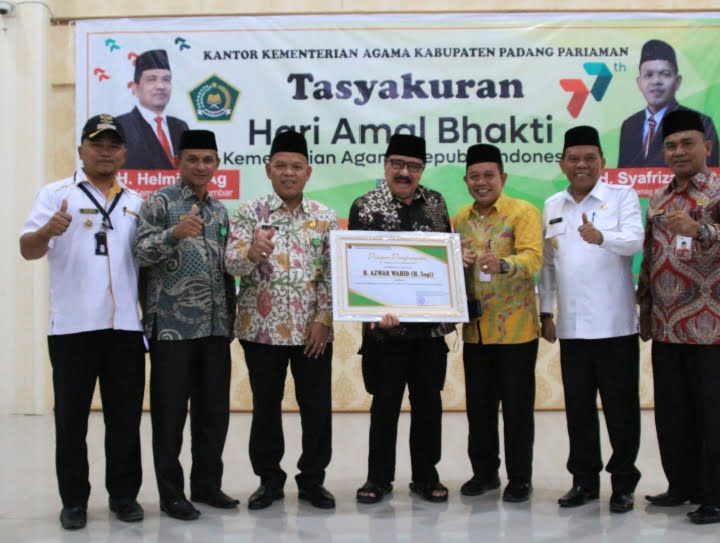 HARIANHALUAN.ID – Haji Azwar Wahid menerima penghargaan dari Kementerian Agama (Kemenag) melalui Kantor Departemen Agama Kabupaten Padang Pariaman, yang diserahkan langsung oleh Kepala Kantor Departemen Agama Padang Pariaman, Syafrizal di ruang pertemuan MAN IC Padang Pariaman, belum lama ini.
