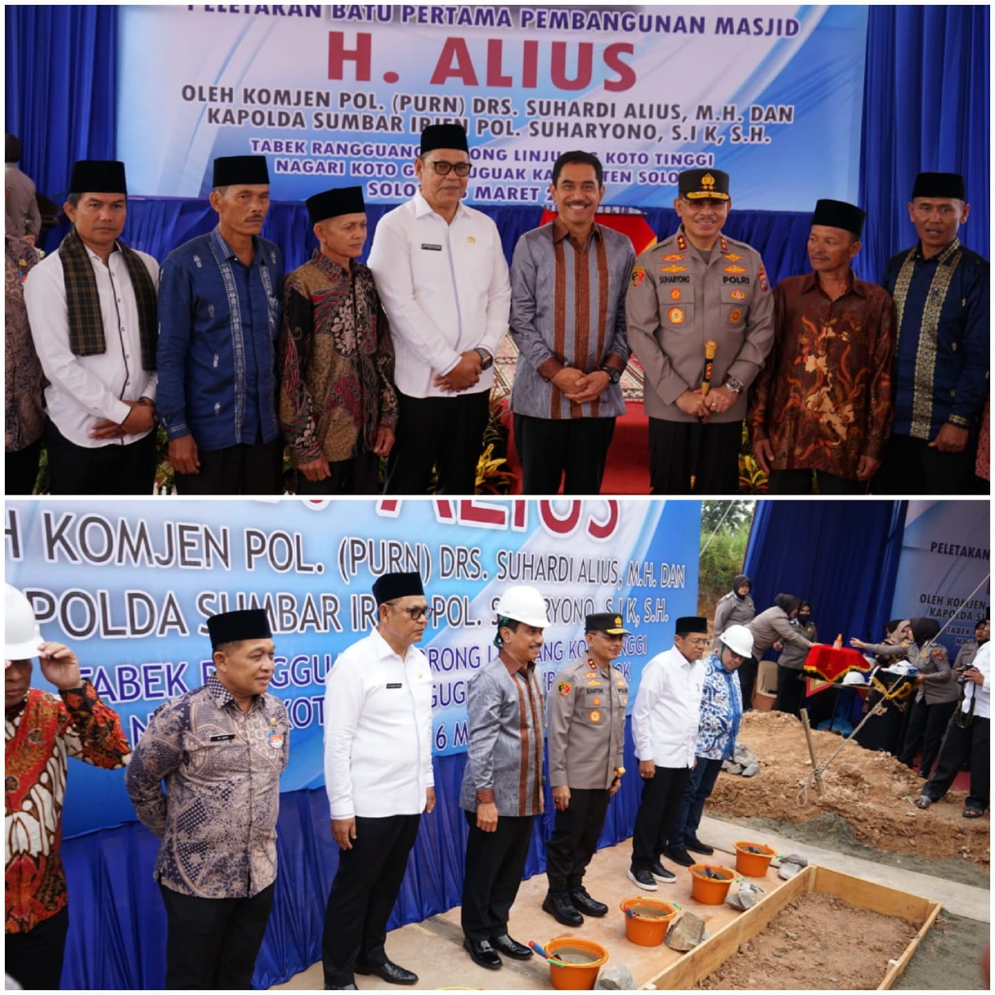HARIANHALUAN.ID – Komjen Pol (Purn) Suhardi Alius beserta Kapolda Sumbar, Irjen Pol Suharyono dan Bupati Solok, Epyardi Asda melakukan peletakan batu pertama sebagai tanda awal pembangunan Masjid Haji Alius di Nagari Koto Gaek Guguk, Kamis (16/3/2023).