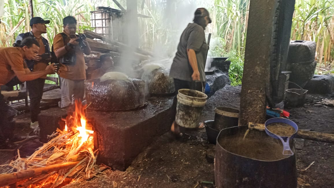 Kasi Kesejahteraan Nagari Lawang, Desriyanto (Baju Hitam) mendampingi Petani Tebu di Jorong Ketaping Nagari Matur, Syafri Jamal di tempat produksi gula tebu miliknya. YESI