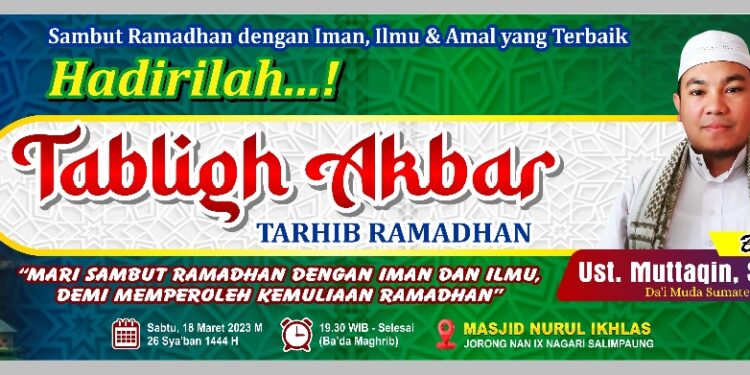 “Malamnya diselenggarakan tabligh akbar dalam rangka menyambut datangnya bulan suci Ramadan 1444 H/2023 M, dengan penceramah Ust.Muttaqin dari Padang Panjang”, kata pengurus Masjid Nurul Ikhlas Nan IX Salimpaung Destuliadi.