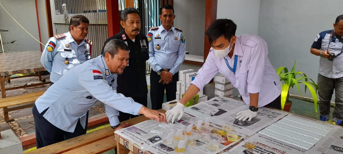 Kepala Kanwil Kemenkumham Sumbar, Haris Sukamto didampinggi Kadiv Pas dan Kalapas Bukittinggi melihat hasil tes urine di Lapas Bukittinggi, Senin (20/3). YURSIL.