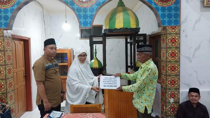 Kegiatan dilanjutkan dengan penyerahan simbolis bantuan berupa uang tunai Rp10 juta rupiah keoada Pengurus Masjid dan perlengkapan alat salat kepada garin masjid