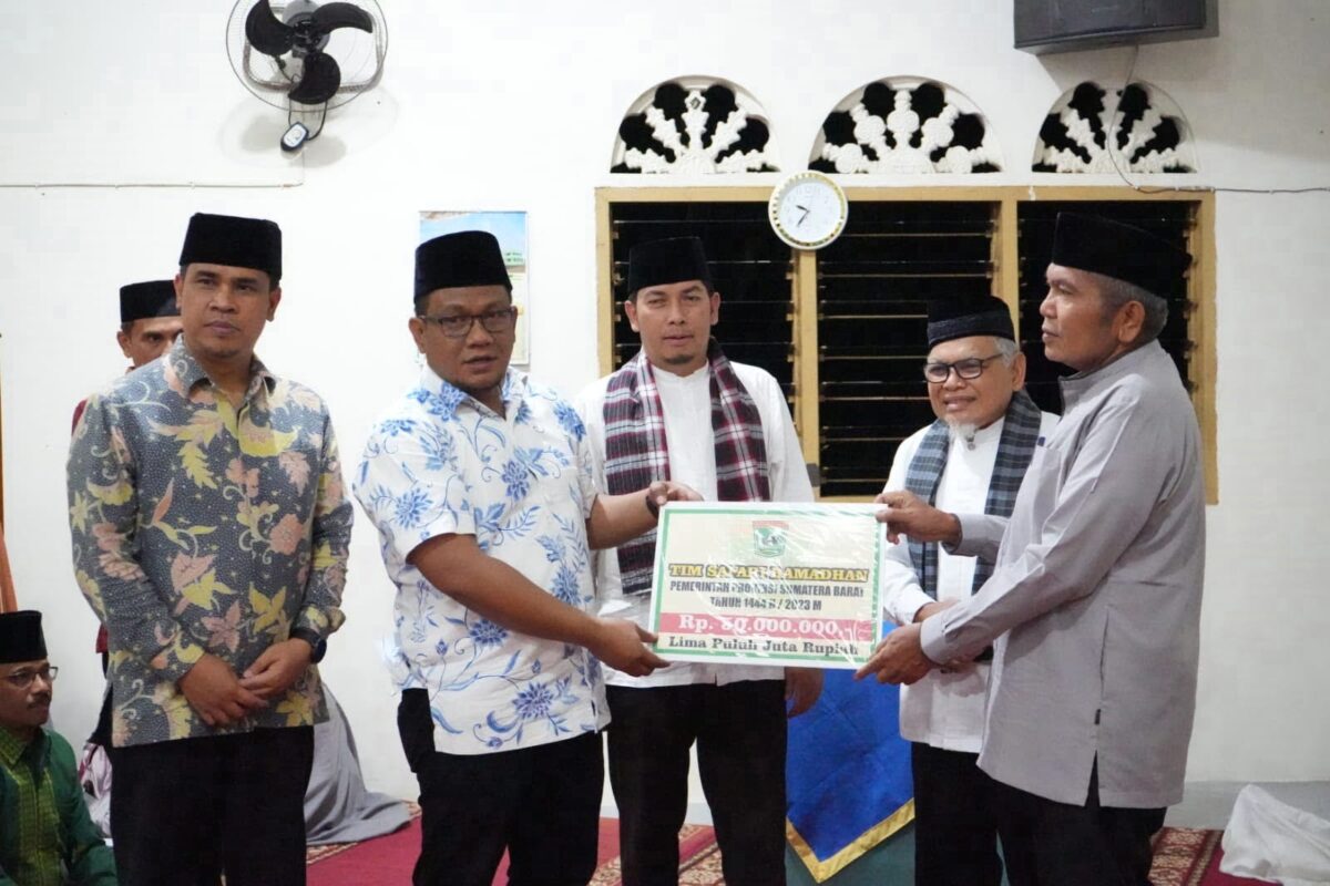 Kepala BPKAD Sumbar, Rosail menyerahkan bantuan untuk pembangunan masjid saat Tim Safari Ramadan Pemprov Sumbar mengunjungi Masjid Al Munawwarah, Lembah Segar, Kota Sawahlunto, Jumat (24/3) malam. IST