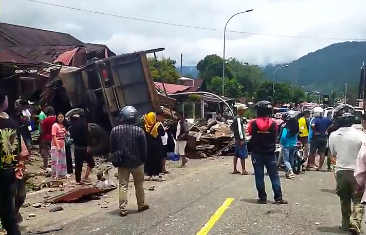Sementara di lokasi kejadian, tampak kondisi truk sudah ringsek. Sejumlah bangunan juga tampak rusak. Informasi yang diperoleh, kecelakaan disebabkan truk rem blong dan menghantam lima mobil lainnya.