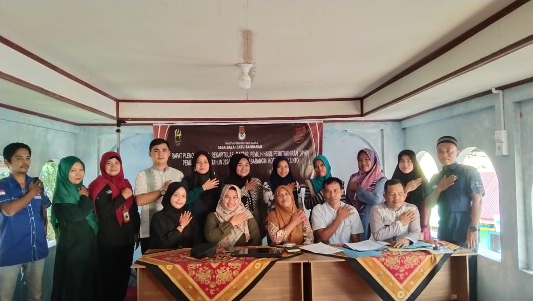 Setelah rapat pleno tersebut dilanjutkan penandatanganan berita acara rekapitulasi daftar perubahan pemilih hasil pemutakhiran oleh PPS Desa Balai Batu Sandaran. (*)