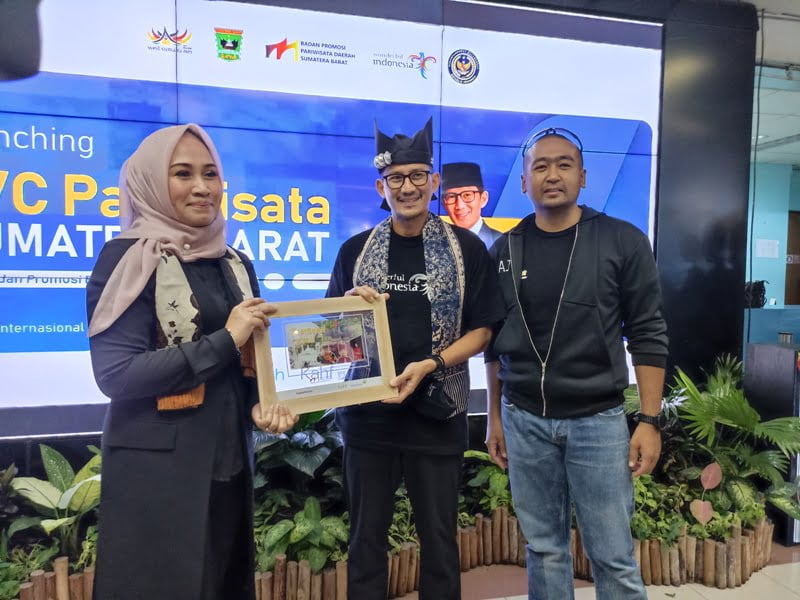 HARIANHALUAN.ID – Menteri Pariwisata dan Ekonomi Kreatif (Menparekraf) Sandiaga Uno meresmikan Television Commercial (TVC) Promosi Pariwisata Sumbar tentang storynomic Budaya Minangkabau di Bandara Internasional Minangkabau (BIM), Jumat (31/3/2023).