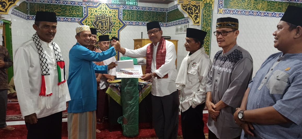 Acara safari Ramadan diakhiri dengan ceramah yang disampaikan al ustadz H. Mawardi Idris, S.Ag, M.Pd dan juga penyerahan bantuan Bupati Sutan Riska untuk masjid setempat. Bantuan bupati berupa uang tunai Rp10 juta, Al-Qur’an 10 buah, Karpet 1 helai dan alas Al Qur dua buah. (*)