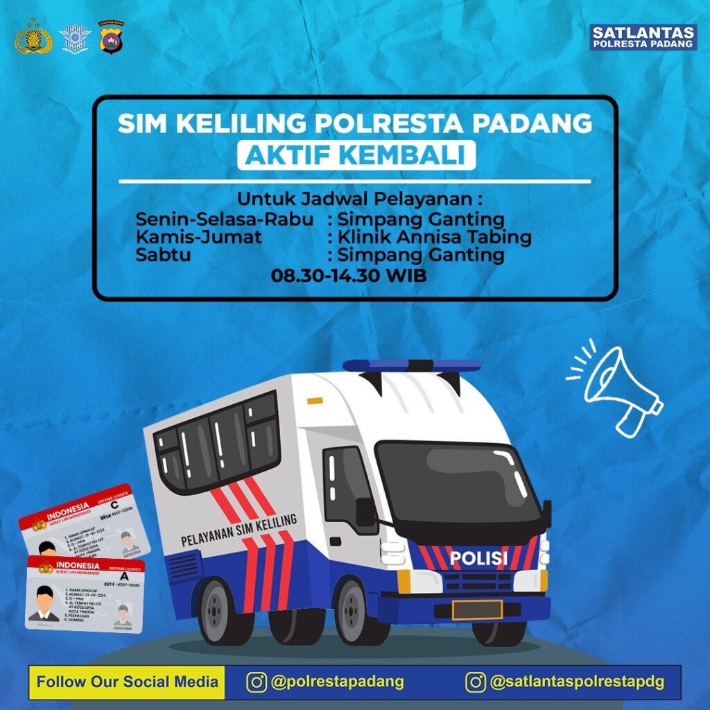 HARIANHALUAN.ID – Surat Izin Mengemudi (SIM) Keliling Satlantas Polresta Padang aktif kembali. SIM keliling ini beroperasi seminggu ke depan, mulai dari Senin (3/4/2023) hingga Sabtu (8/4/2023).