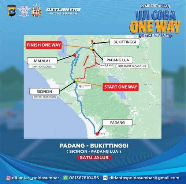 Lebih lanjut ia mengatakan, sistem jalan satu arah ini dimulai dari Sicincin, Kabupaten Padang Pariaman sampai ke Padang Luar, Kabupaten Agam (naik). Sedangkan turun Bukittinggi ke Malalak, Kabupaten Agam, dengan sistem satu arah juga.