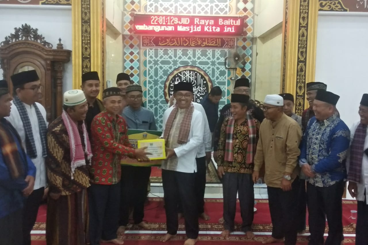 Bupati Solsel, Khairunas bersama jajaran Pemkab Solsel serahkan bantuan pembangunan kepada Masjid Baitul Hikmah Durian Taruang, Solok Selatan, Kamis (6/4). KIKI NOFRIJUM