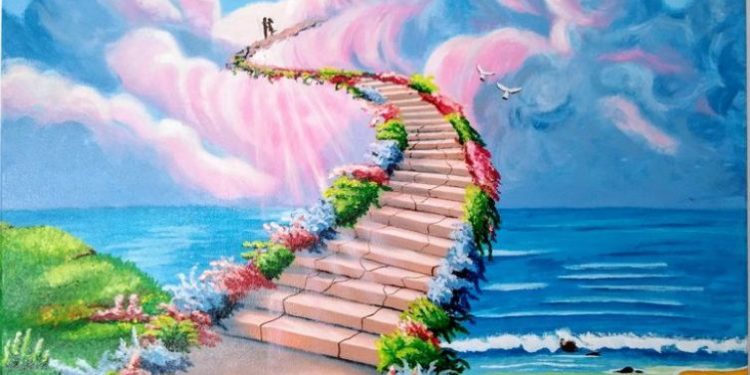 This is the newest acrylic painting. Picture shows stairs to heaven with a couple of lovers on them. Acrylic on canvas 50×60 cm. Edges painted.