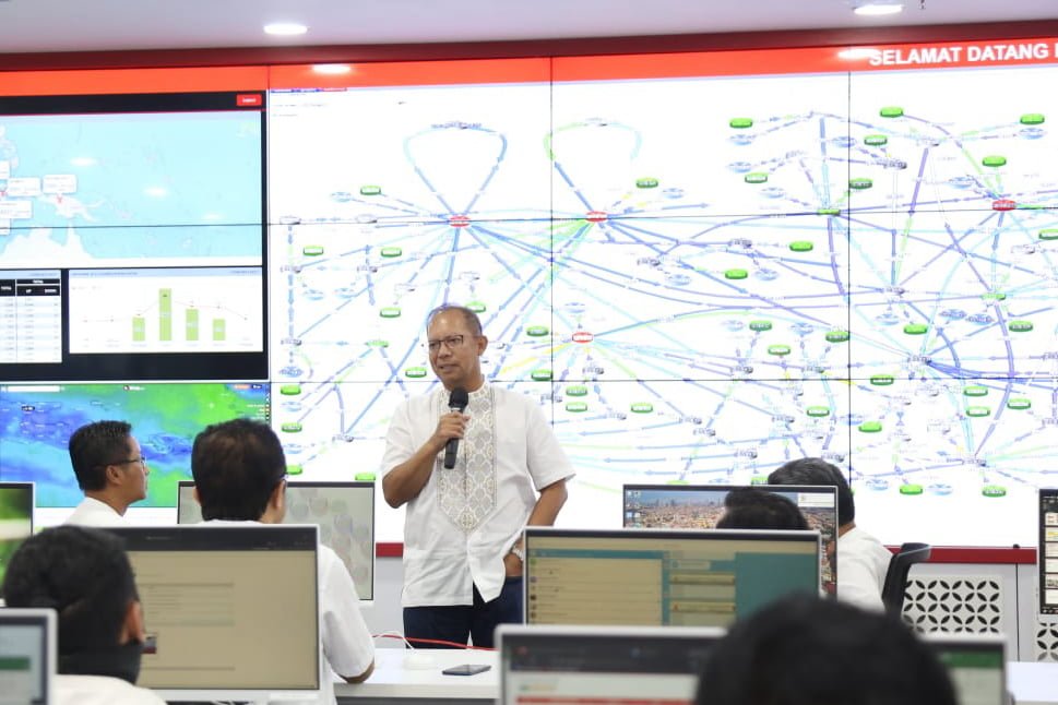 Direktur Keuangan dan Manajemen Risiko Telkom Heri Supriadi meninjau kesiapan infrastruktur layanan jelang hari raya Idul Fitri ke Posko Siaga RAFI TelkomGroup yang berlokasi di Regional Operation Center (ROC) Telkom Regional V Surabaya, pada Rabu (13/4). IST