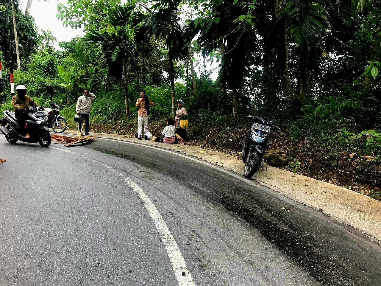 Pengendara sepeda motor terjatuh akibat tumpahan solar di Kelok Kajai Nagari III Koto Aur Malintang. IST