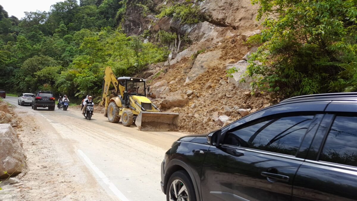 Pantauan media ini, pada malam hari pertama lebaran terjadi curah hujan tinggi, pada titik tersebut terjadi longsor meski tidak begitu mengganggu arus lalulintas karena pihak Balai Pengawas Jalan Nasional (BPJN) sudah mempersiapkan alat berat di titik tersebut.”Ya kita memang menstandby kan alat berat pada titik rawan longsor termasuk di perbatasan dua kabupaten tersebut,” ucap PPTK BPJN Roli Erianto, kepada media ini.