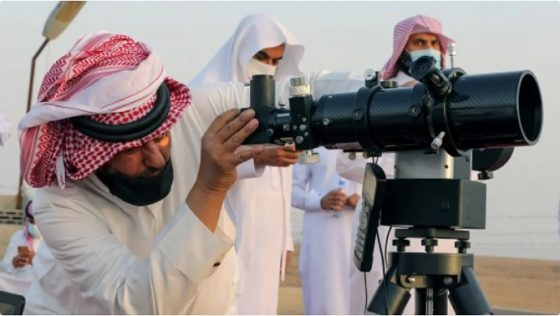 Di Arab Saudi, bulan sabit yang menandakan awal Ramadan terlihat pada hari Jumat di Hautat Sudair di Riyadh oleh para astronom dari Departemen Observatorium Astronomi Universitas Majmaah.