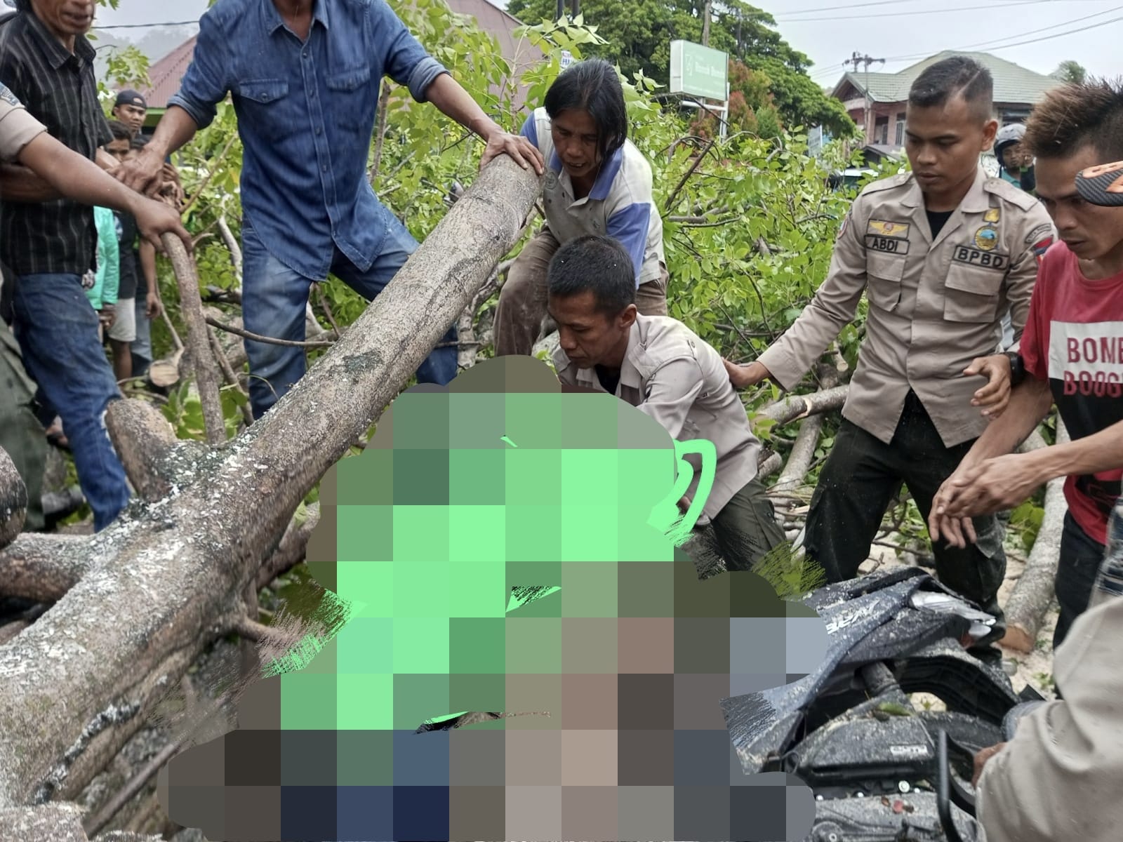 “Kejadian sekitar pukul 12.30 WIB. Pohon tumbang menutup akses jalan dan menimpa Pengendara Motor Vario dengan Nomor Polisi BA 4828 AAB,” ujarnya.