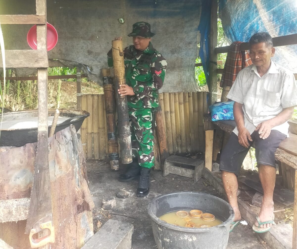 Seperti saat sela-sela waktu istirahat, Anggota Satgas TMMD ke 116 Kodim 0306/50 Kota, Koptu Yopri melakukan Komunikasi Sosial (Komsos) kepada pengrajin gula aren dari air pohon nira yang dikelola warga bernama Soleh di Jorong Balai Malintang Nagari Sitanang Kecamatan Lareh Sago Halaban, Minggu (14/5).