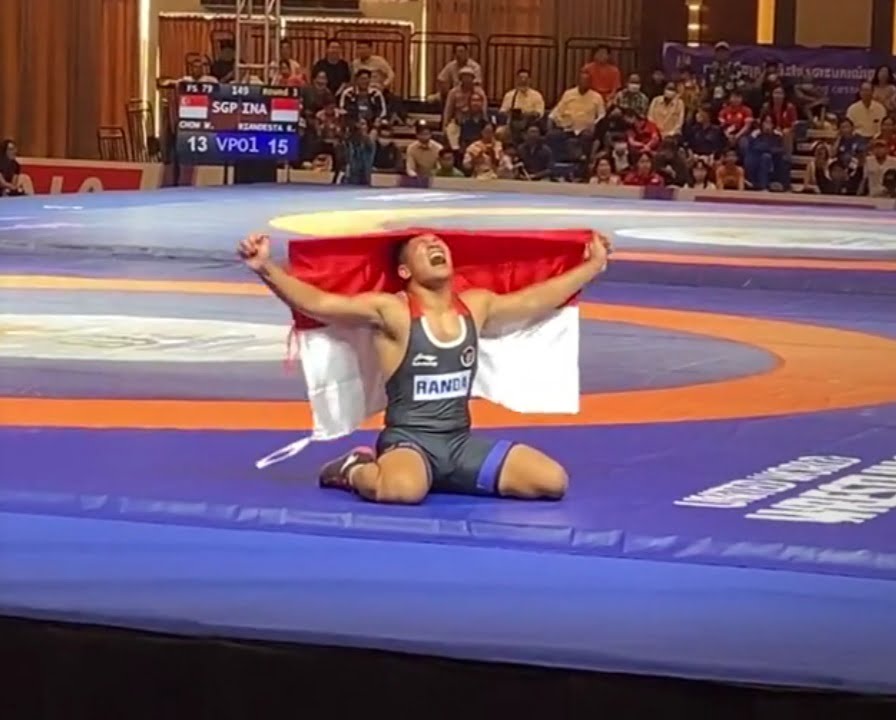 Bripda Randa Rian Desta, yang sehari-hari berdinas di Direktorat Samapta Polda Sumbar. Pria kelahiran ranah Minang ini memenangkan cabang olahraga (cabor) gulat untuk nomor freestyle 79 kg putra, setelah mengalahkan atlet Singapura, Weng Luen Gaary Chow di laga puncak yang dimainkan di Chory Changvar International Convention and Exhibition Center, Phnom Penh, Selasa (16/5/2023).