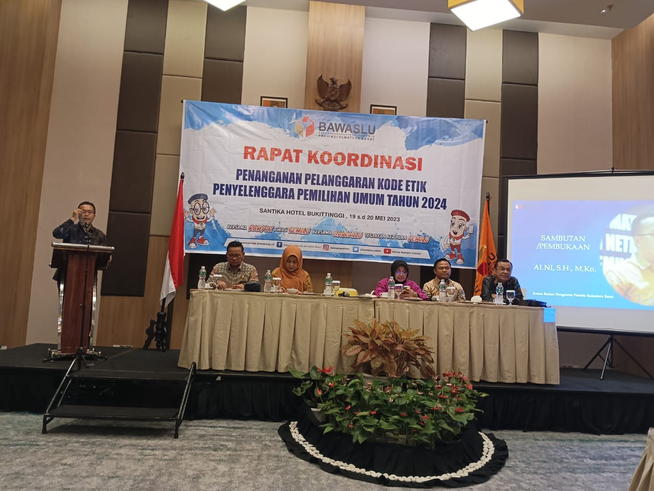 BUKITTINGGI, HARIANHALUAN.ID ———Badan Pengawas Pemilu (Bawaslu) Sumbar menggelar Rapat Koordinasi Penanganan Pelanggaran Kode Etik Penyelenggara Pemilu 2024 di Ballroom Hotel Santika, Kota Bukittinggi Jumat (19/5) kemarin.