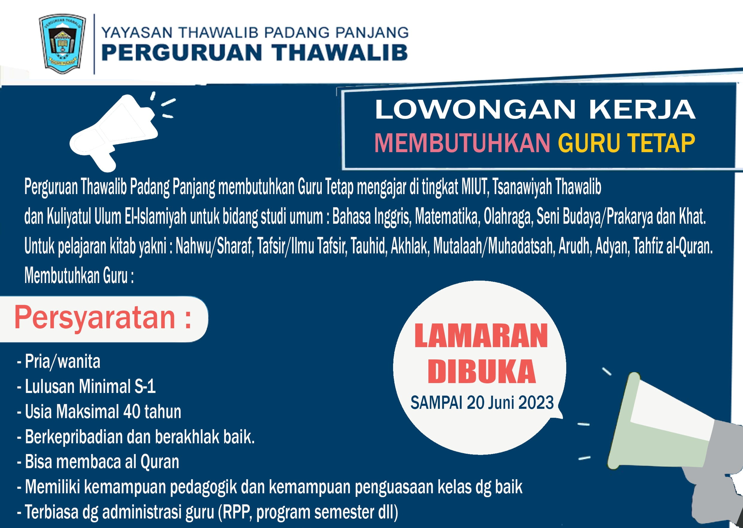 HARIANHALUAN.id – Pondok Pesantren Thawalib Padang Panjang kembali membuka lowongan guru tetap sebagai untuk sejumlah mata pelajaran. Guru baru tersebut nantinya MIUT, ditempatkan di MTs Thawalib Putra/Putri dan KUI Putra/Putri.
