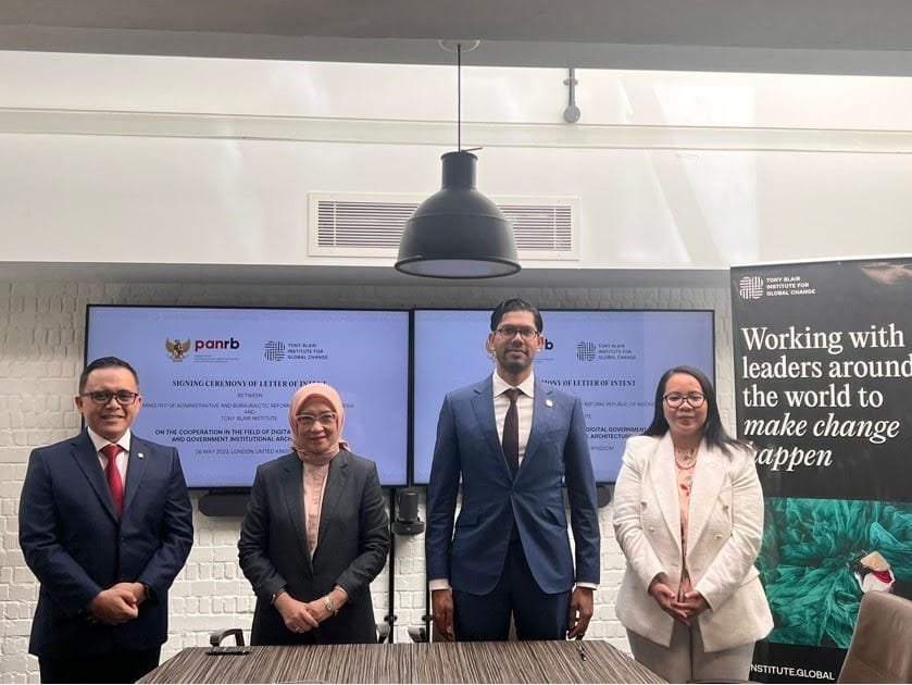 JAKARTA, HARIANHALUAN.ID — Pemerintah Republik Indonesia, melalui Kementerian Pendayagunaan Aparatur Negara dan Reformasi Birokrasi, menandatangani surat minat kerja sama (Letter of Intent/LoI) dengan Tony Blair Institute of Global Change (TBI) untuk menjajaki kolaborasi di bidang pemerintahan digital, Jumat (26/5) lalu.