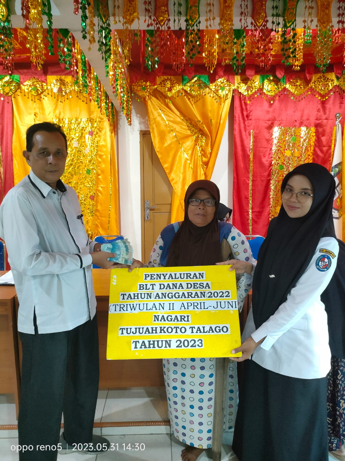 Sebanyak 64 kepala Keluarga Penerima Manfaat (KPM) telah menerima BLT DD dengan jumlah Rp900.000 per kepala keluarga untuk tiga bulan. Penyerahan BLT DD ini dihadiri Wali Nagari Tujuah Koto Talago, pendamping desa, bamus nagari, serta pihak terkait lainnya.