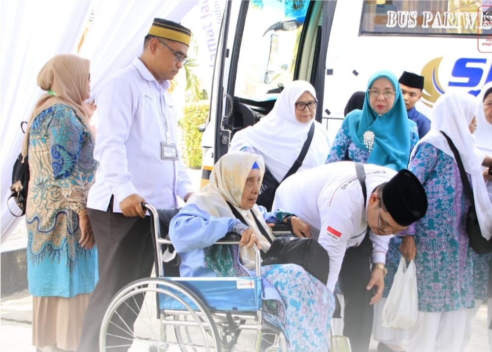 Kedatangan 393 jemaah disambut tim PPIH dengan mengutamakan jemaah lansia. Dengan cekatan petugas membantu jemaah turun dari bus. Bagi jemaah yang risti langsung dibantu menggunakan kursi roda.