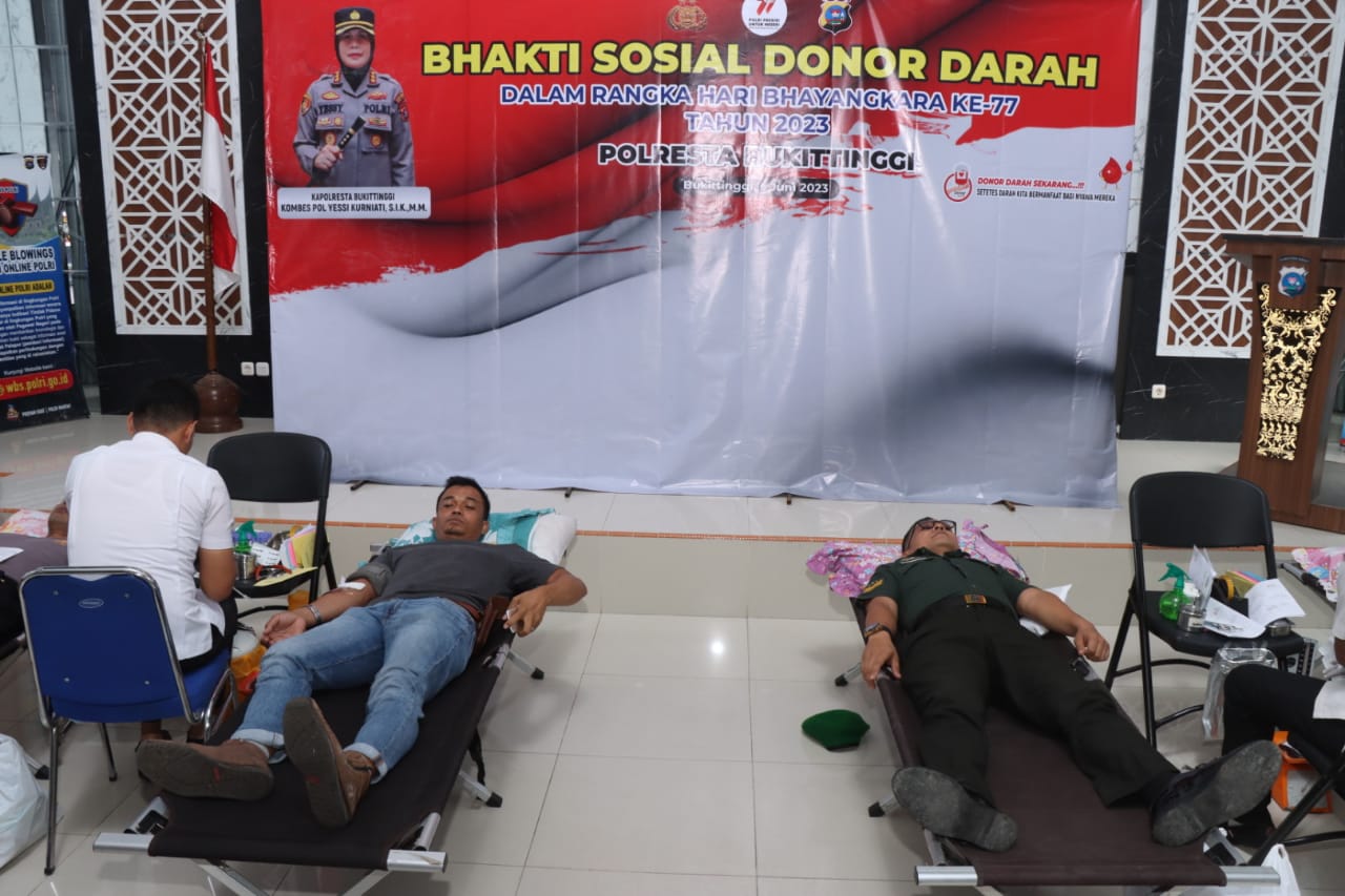 Kapolresta Bukittinggi, Kombes Pol Yessi Kurniati melalui Kasi Humas AKP Sitinjak mengatakan, donor darah dilaksanakan Polresta Bukittinggi adalah sebagai bentuk kepedulian kepada sesama dan juga untuk menyambut Hari Bhayangkara ke-77 tahun 2023.