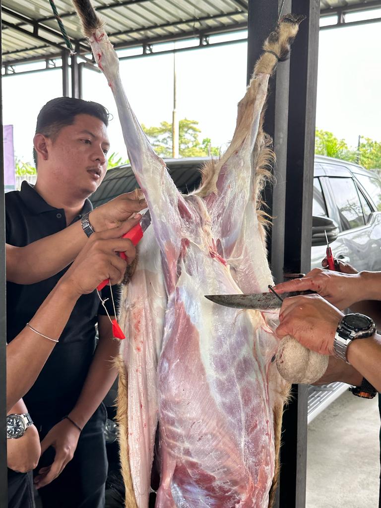 Sebanyak 5 ekor sapi disembelih Rabu (28/6) di Pegadaian Kantor Wilayah dan 1 ekor sapi disumbangkan ke masyarakat Tenayan