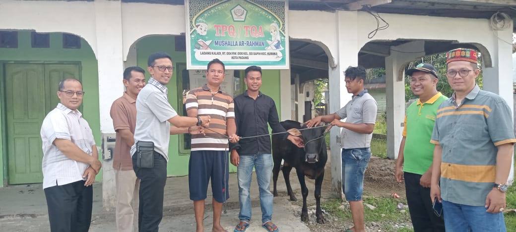 HARIAN HALUAN. ID – Keluarga besar Kantor Kementerian Agama (Kankemenag) Padang menyerahkan satu ekor sapi kurban untuk jamaah Mushala Ar Rahman Ladang Kaladi RT 04 RW 06 Kelurahan Sungai Sapih Kecamatan Kuranji Padang.