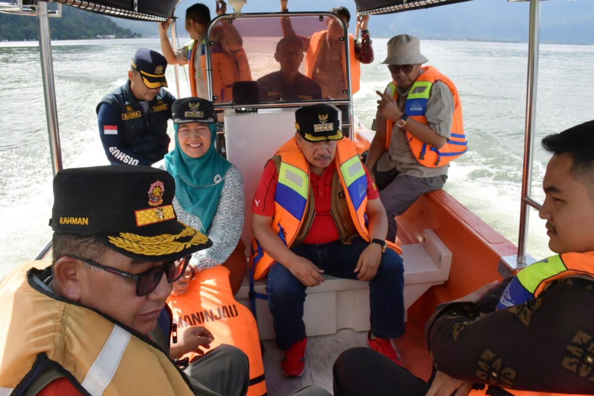 Saat meninjau ke lokasi terparah di Jorong Pantas Nagari Tanjung Sani, Bupati Agam menggunakan speed boat milik PLTA Maninjau.