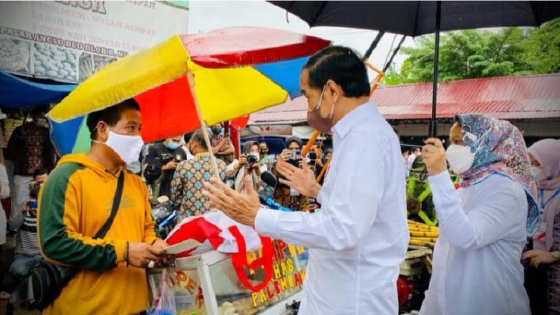 HALUANNEWS, JAMBI – Mengawali kunjungan kerjanya ke Provinsi Jambi, Presiden Joko Widodo memberikan Bantuan Langsung Tunai (BLT) Minyak Goreng kepada sejumlah pedagang kecil dan penerima di Pasar Rakyat Angso Duo Baru, Kota Jambi, Kamis, 7 April 2022. Presiden berharap bantuan tersebut bisa membantu meringankan beban masyarakat.