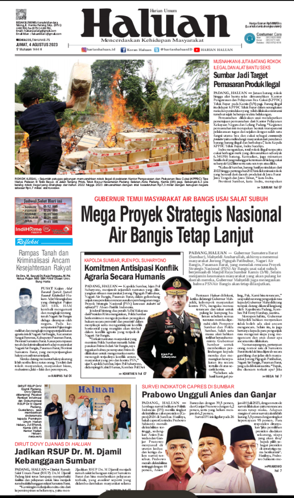 HARIANHALUAN.id – Koran Haluan hari ini edisi Jumat, 4 Agustus 2023 menyajikan berita terkini seputar Sumatera Barat, Nasional hingga mancanegara.
