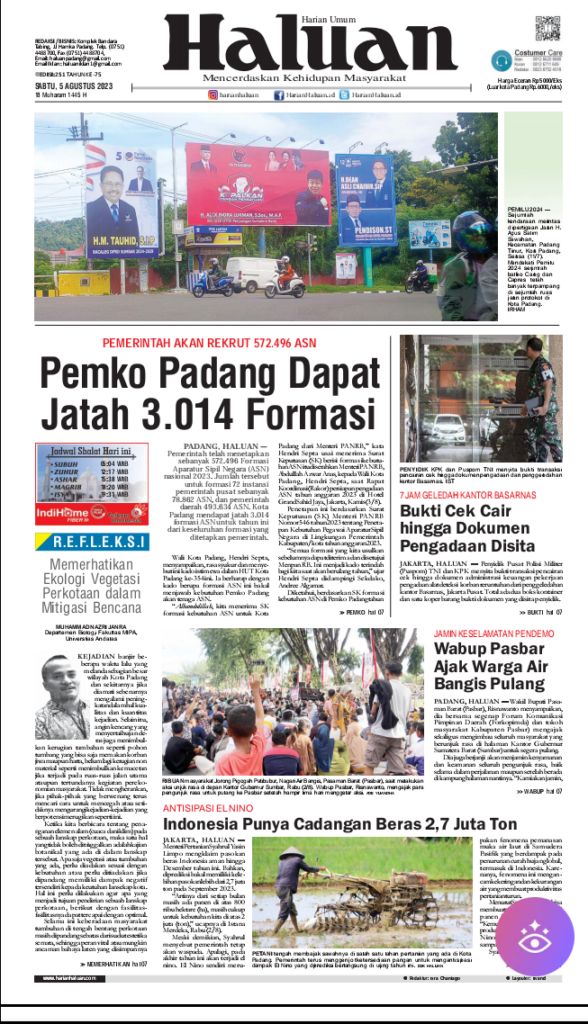 HARIANHALUAN.id – Koran Haluan hari ini edisi Sabtu, 5 Agustus 2023 menyajikan berita terkini seputar Sumatera Barat, Nasional hingga mancanegara.