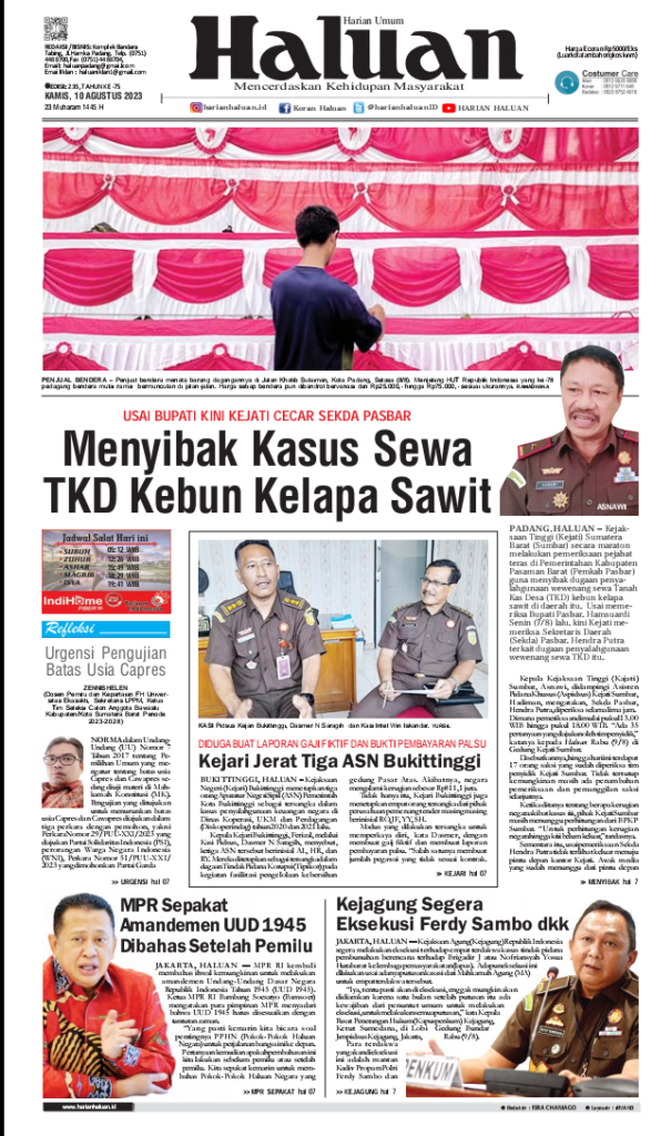 HARIANHALUAN.id – Koran Haluan hari ini edisi Kamis, 10 Agustus 2023 menyajikan berita terkini seputar Sumatera Barat, Nasional hingga mancanegara.