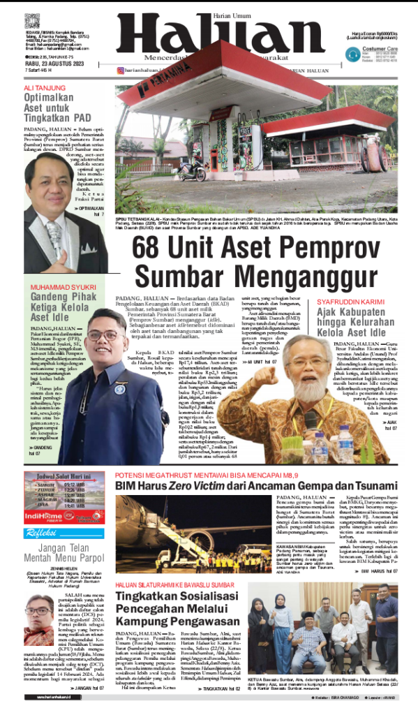 Pada edisi hari ini, Koran Haluan mengupas berbagai informasi terkini di Sumatera Barat, Nasional dan Mancanegara. Diantaranya, 68 Unit Aset Pemprov Sumbar Menganggur, Warga Air Bangis Tuntut Dampak PSN, Empat Parpol Absen di Pemilu Pariaman dan UM Sumatera Barat Sediakan Beasiswa Rp6,2 Miliar.