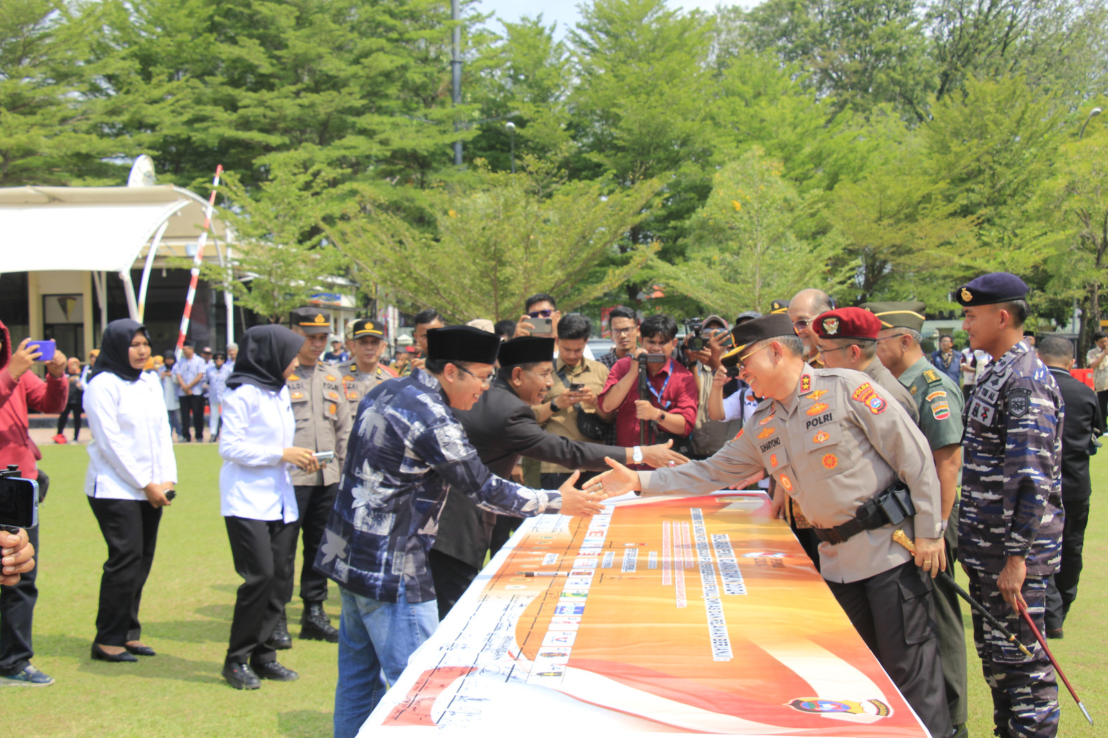 HARIANHALUAN.ID – Kapolda Sumatra Barat (Sumbar), Irjen Pol Suharyono memimpin Deklarasi Pemilu Damai 2024 di Sumbar, Kamis (24/8/2023) di halaman Mapolda Sumbar.