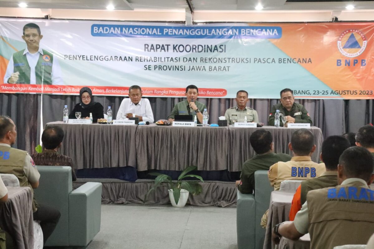 SUBANG, HARIANHALUAN.ID – Kepala Badan Nasional Penanggulangan Bencana (BNPB) Letjen TNI Suharyanto memimpin Rapat Koordinasi Penyelenggaran Rehabilitasi dan Rekonstruksi di wilayah Provinsi Jawa Barat, yang diselenggarakan di Kabupaten Subang, Jawa Barat pada Kamis (24/8).