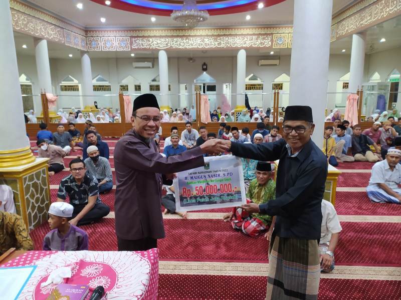 HALUANNEWS, PADANG — Anggota DPRD Provinsi Sumatra Barat (Sumbar) dari Fraksi PAN, Maigus Nasir menyerahkan bantuan dana hibah sebesar Rp50 juta usai memberikan ceramah dalam safari Ramadannya di Masjid An Nur, Kelurahan Sungai Sapiah, Kecamatan Kuranji, Kota Padang, pada Selasa (12/4/2022) malam.