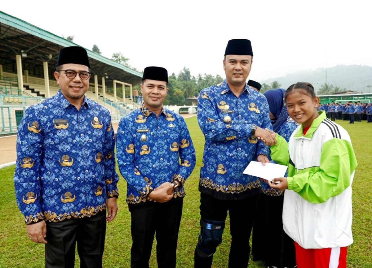 Bupati Sijunjung Benny Dwifa Yuswir SSTP,M.Si menyerahkan bonus kepada atlet Tinju Kabupaten Sijunjung Roza Lina Sari yang meraih medali emas di ajang POPNAS ke XVI di Palembang, Selasa (19/9) di Lapangan M Yamin Muaro Sijunjung. IST