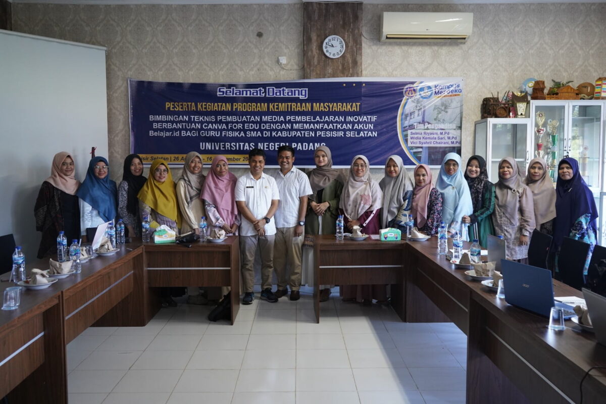 Berangkat dari kondisi itu, ia dan beberapa dosen lainnya membantu para guru Fisika di Kabupaten Pesisir Selatan untuk bisa menyiapkan bahan ajar yang lebih inovatif dan tentunya berbasis digital. “Dalam hal ini kami berikan bimbingan teknis pembuatan media pembelajaran inovatif berbantuan Canva for Education dengan memanfaatkan akun belajar.id. Guru akan diberikan langkah-langkah rinci sampai mereka bisa menggunakannya,” kata Selma didampingi anggota Widia Kemala Sari, M.Pd dan Vici Syahril Chairani, M.Pd.