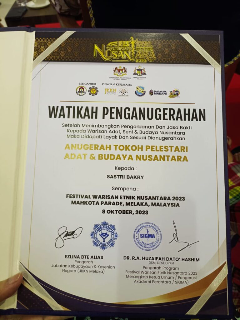Sastri Bakry Menerima Anugrah Pelestari Adat dan Budaya Nusantara dari Malaysia