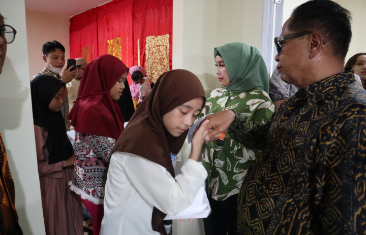 Owner Basko Group, Basrizal Koto didampingi istri, Ny. Elita Basko menyantuni anak yatim sekitar lokasi pembangunan Basko City Mall.