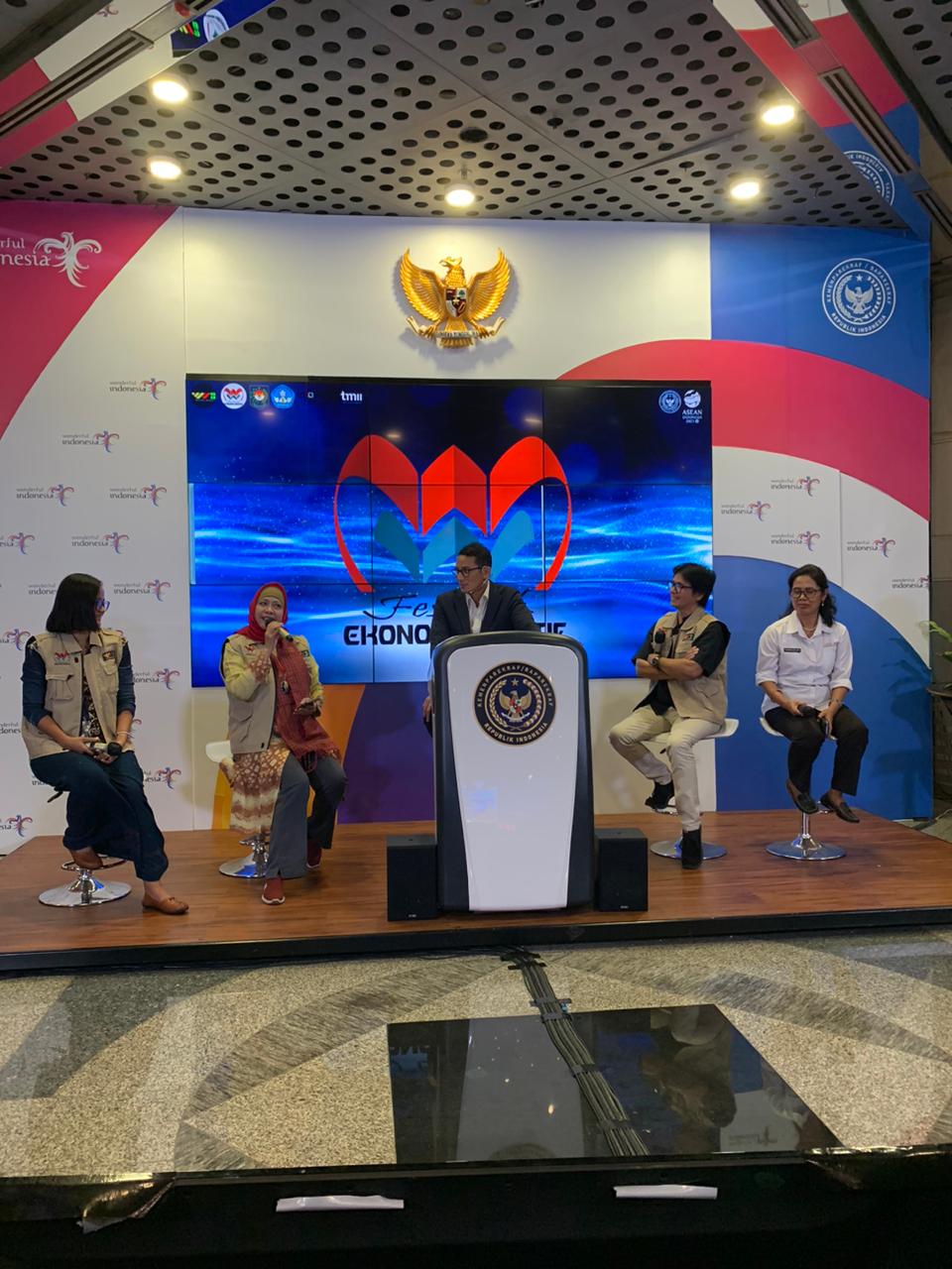Hari ini, Pemimpin Wara Wiri Feskraf, Sastri Bakry, Direktur Keuangan Wara Wiri Feskraf, Amelia Fitriani, dan Salah satu pengisi Acara, Gilang Ramadhan melakukan promosi bersama Menteri Pariwisata dan Ekonomi Kreatif, Sandiaga Salahuddin Uno didampingi Plt Direktur Even nasional dan internasional dalam acara WBSU yang diselenggarakan oleh Kemenparekraf, Senin (23/10/2023).