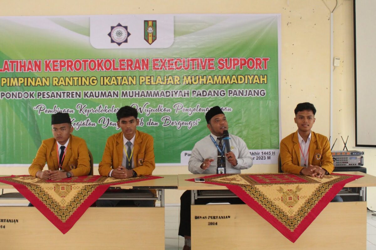 HARIANHALUAN.id – Menyadari akan pentingnya peran protokol dalam melaksanakan kegiatan resmi dan menyambutan tamu, Pimpinan Ranting Ikatan Pelajar Muhammadiyah (IPM) Pondok Pesantren Kauman Muhammadiyah Padang Panjang menggelar pelatihan keprotokoleran Executive Support pada 23-24 Oktober 2023.