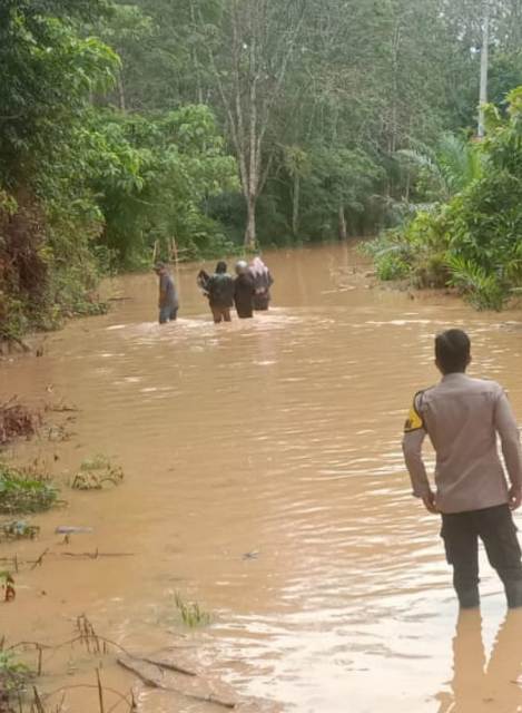 Sampai sore ini air terus menggenangi badan jalan, warga yang akan melintas menuju Pulau Punjung, Timpeh, tidak bisa dilewati.