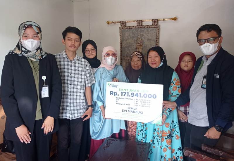 HALUANNEWS, PADANG – Badan Penyelenggara Jaminan Sosial (BPJS) Ketenagakerjaan Cabang Padang menyerahkan santunan Jaminan Kematian (JKM) kepada ahli waris Evi Marzuki, yang meninggal dunia pada 8 Februari lalu. Almarhum, merupakan karyawan Rili Group yang telah bekerja sejak Tahun 2014.